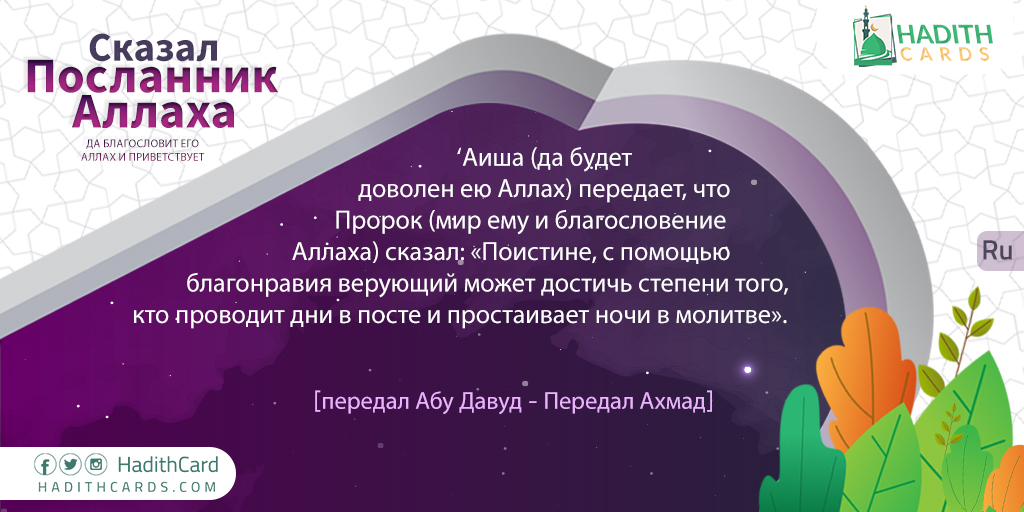 Аиша (да будет доволен ею Аллах) передает, что Пророк (мир ему и благословение Аллаха) сказал: «Поистине, с помощью благонравия верующий может достичь степени того, кто проводит дни в посте и простаивает ночи в молитве