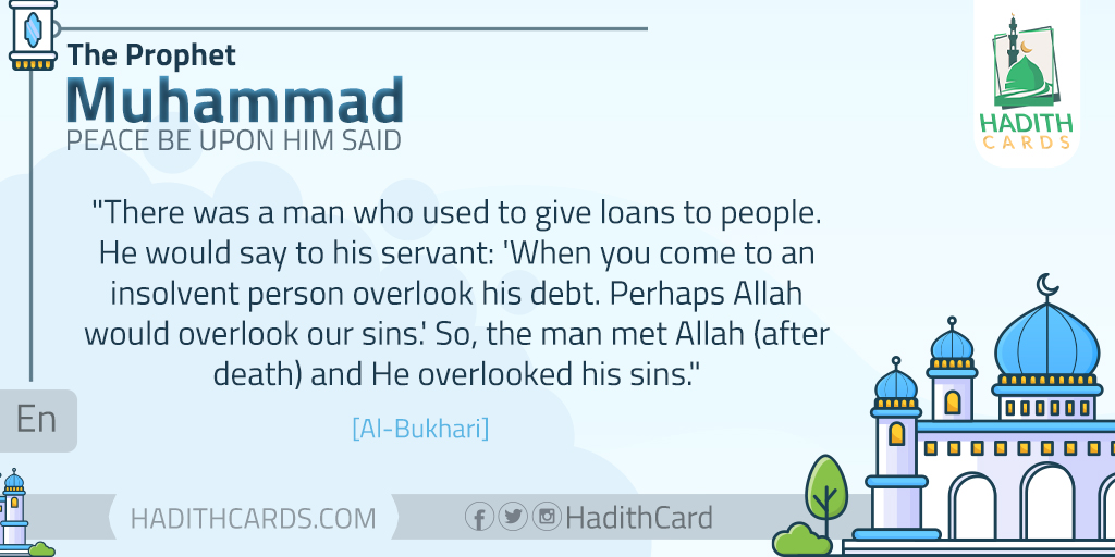 There was a man who used to give loans to people. He would say to his servant: 'When you come to an insolvent person overlook his debt. Perhaps Allah would overlook our sins.' So, the man met Allah (after death) and He overlooked his sins. [Al-Bukhari]