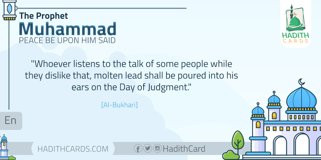 Whoever listens to the talk of some people while they dislike that, molten lead shall be poured into his ears on the Day of Judgment. [Al-Bukhari]