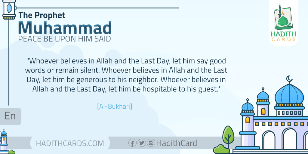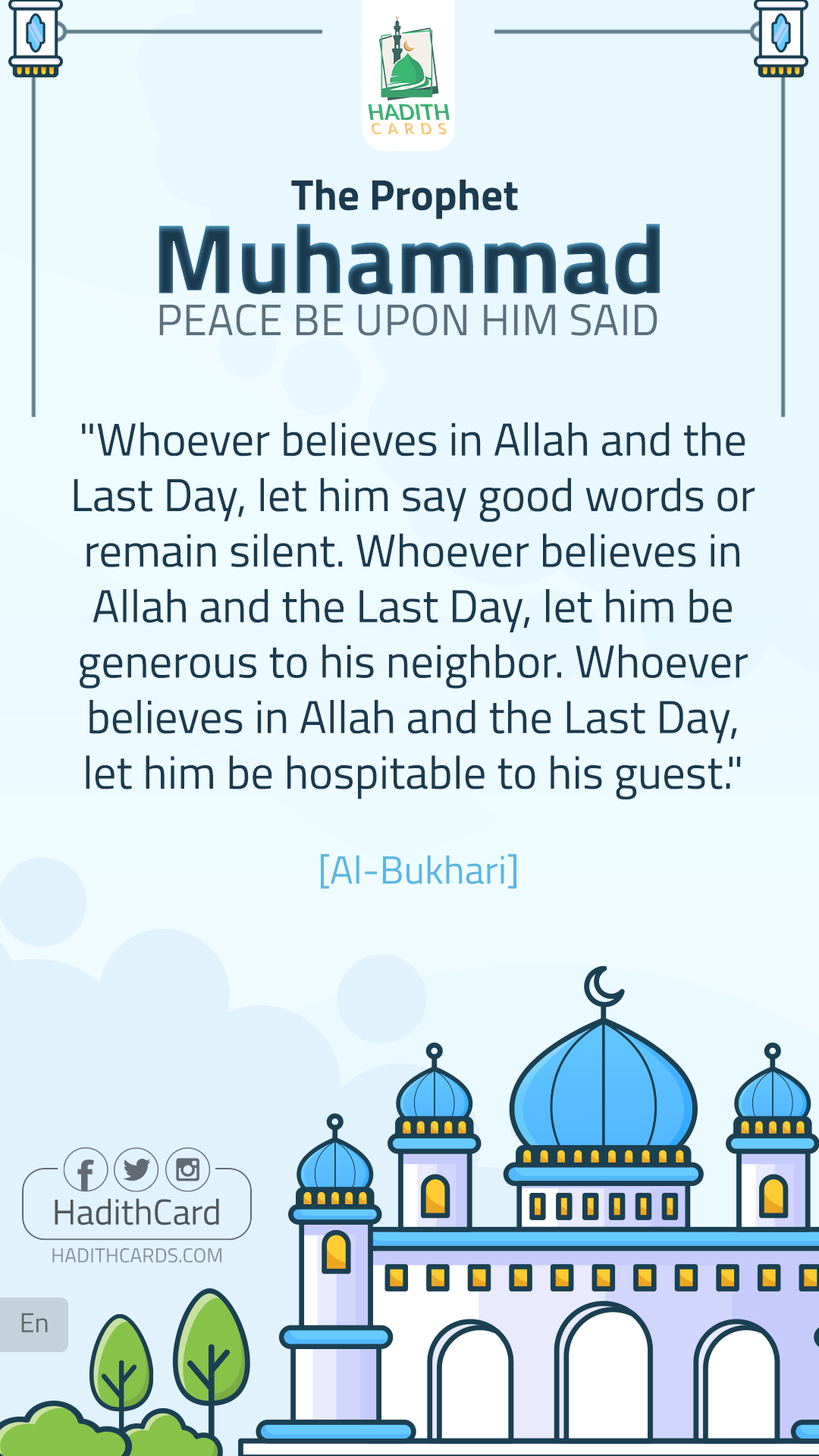 Whoever believes in Allah and the Last Day, let him say good words or remain silent. Whoever believes in Allah and the Last Day, let him be generous to his neighbor. Whoever believes in Allah and the Last Day, let him be hospitable to his guest.