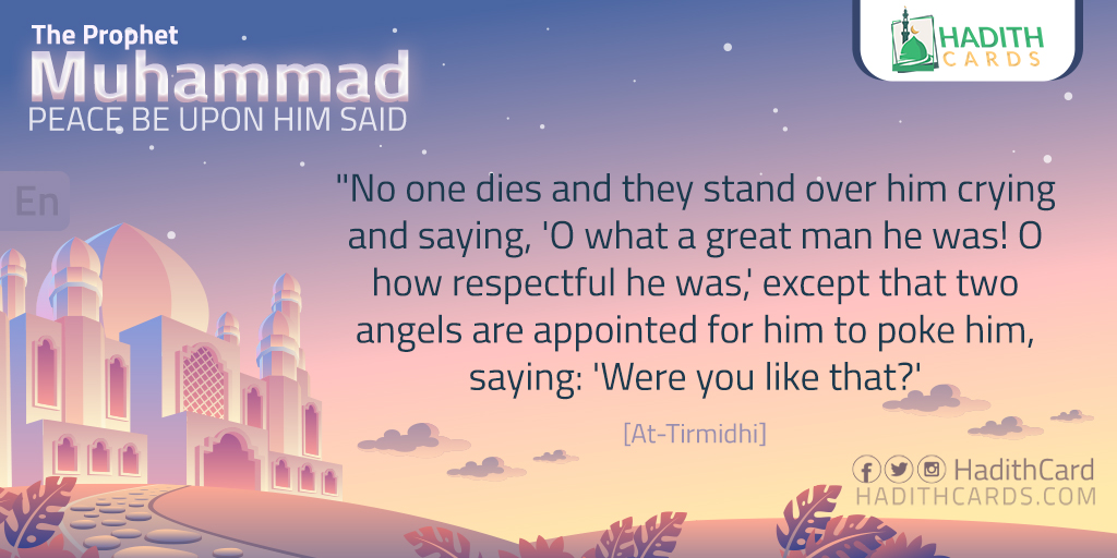 No one dies and they stand over him crying and saying, 'O what a great man he was! O how respectful he was,' except that two angels are appointed for him to poke him, saying: 'Were you like that?