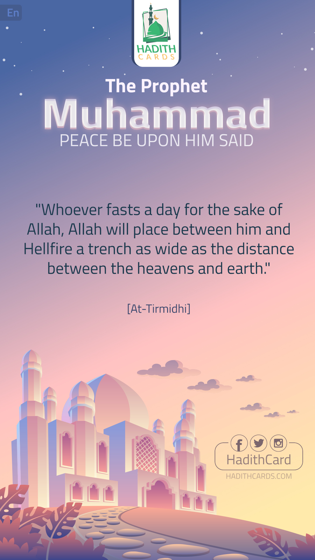 Whoever fasts a day for the sake of Allah, Allah will place between him and Hellfire a trench as wide as the distance between the heavens and earth.