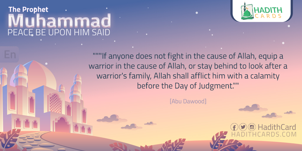 "If anyone does not fight in the cause of Allah, equip a warrior in the cause of Allah, or stay behind to look after a warrior's family, Allah shall afflict him with a calamity before the Day of Judgment.