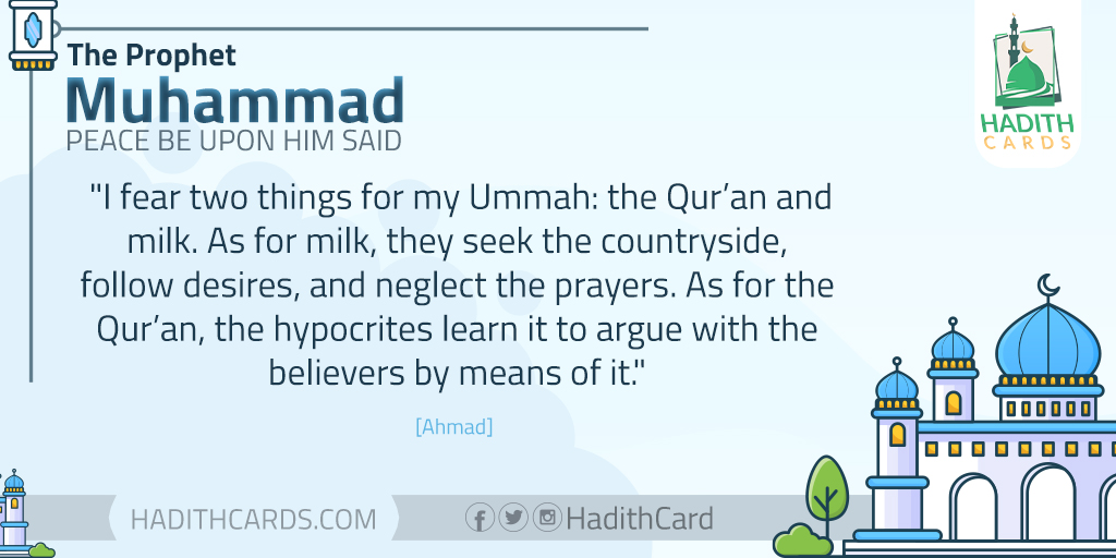 I fear two things for my Ummah: the Qur’an and milk. As for milk, they seek the countryside, follow desires, and neglect the prayers. As for the Qur’an, the hypocrites learn it to argue with the believers by means of it.