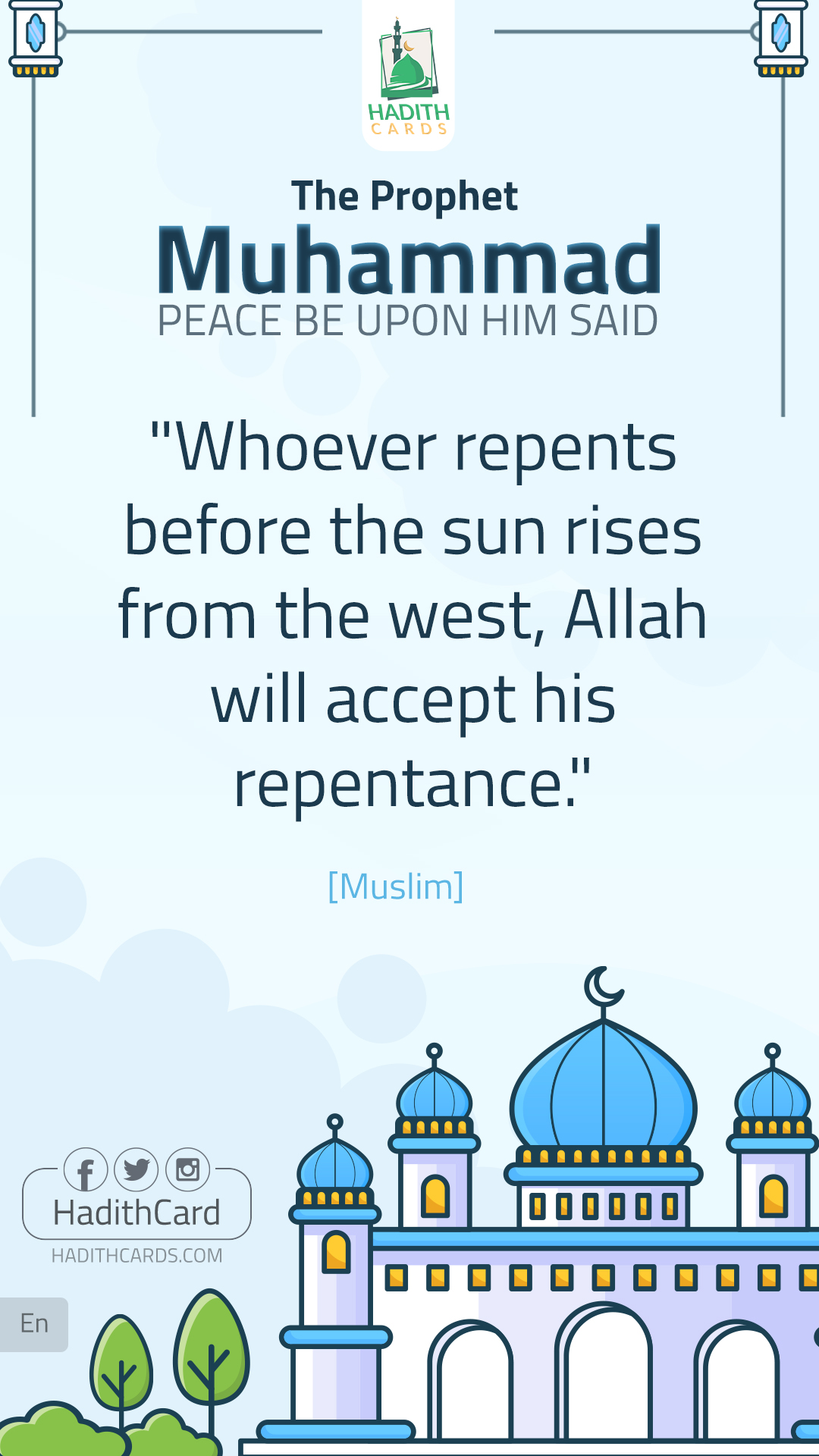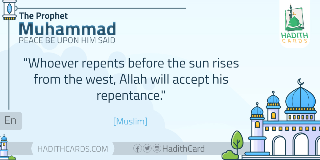 «مَنْ تَابَ قَبْلَ أَنْ تَطْلُعَ الشَّمْسُ مِنْ مَغْرِبِهَا تَابَ اللهُ عَلَيْهِ» (مسلم)