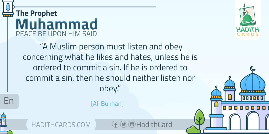 A Muslim person must listen and obey concerning what he likes and hates, unless he is ordered to commit a sin. If he is ordered to commit a sin, then he should neither listen nor obey. [Al-Bukhari]