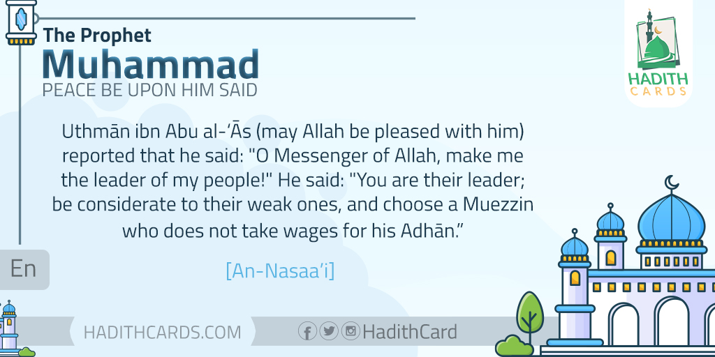 Uthmān ibn Abu al-‘Ās (may Allah be pleased with him) reported that he said: "O Messenger of Allah, make me the leader of my people!" He said: You are their leader; be considerate to their weak ones, and choose a Muezzin who does not take wages for his Adhān.”