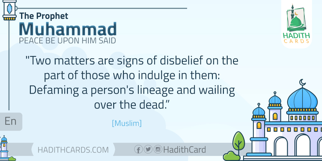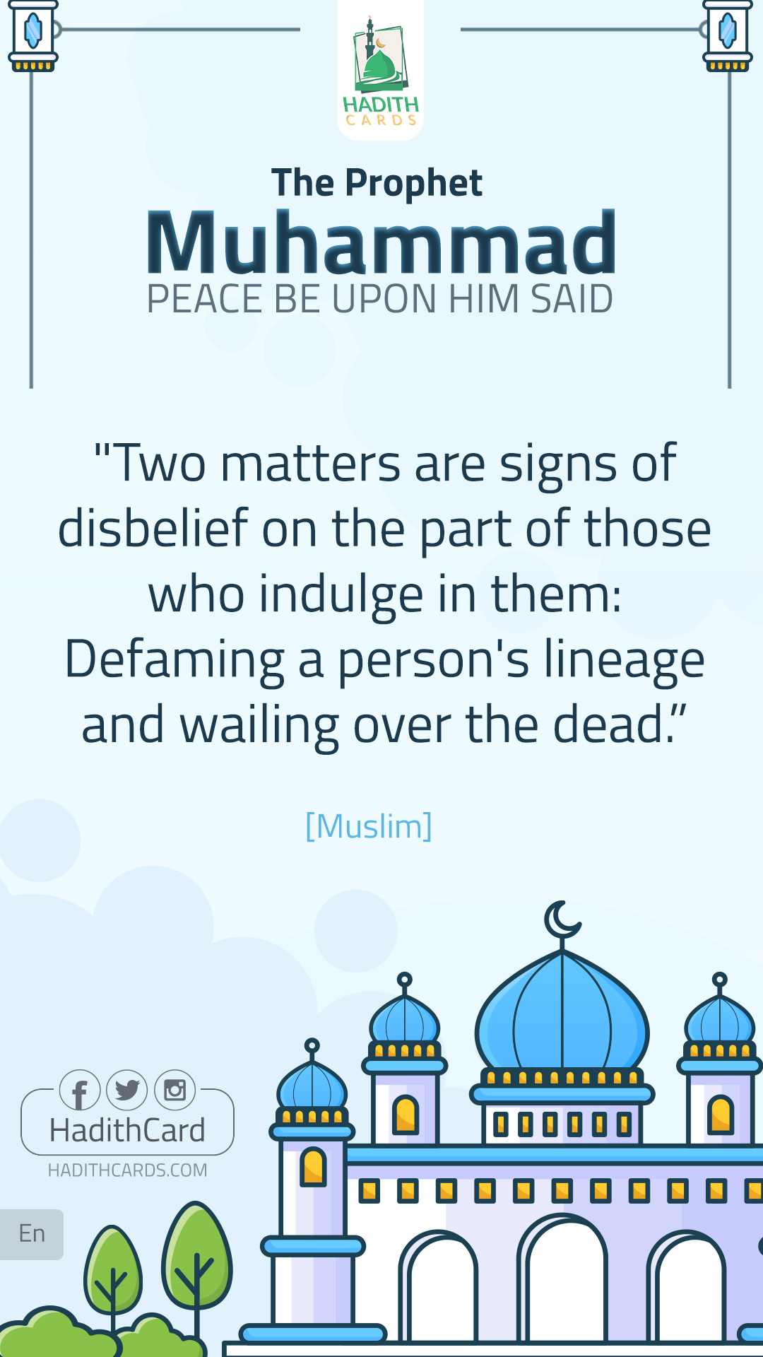 Two matters are signs of disbelief on the part of those who indulge in them: Defaming a person's lineage and wailing over the dead. [Muslim]