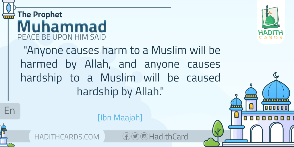 Anyone causes harm to a Muslim will be harmed by Allah, and anyone causes hardship to a Muslim will be caused hardship by Allah. [Ibn Maajah]