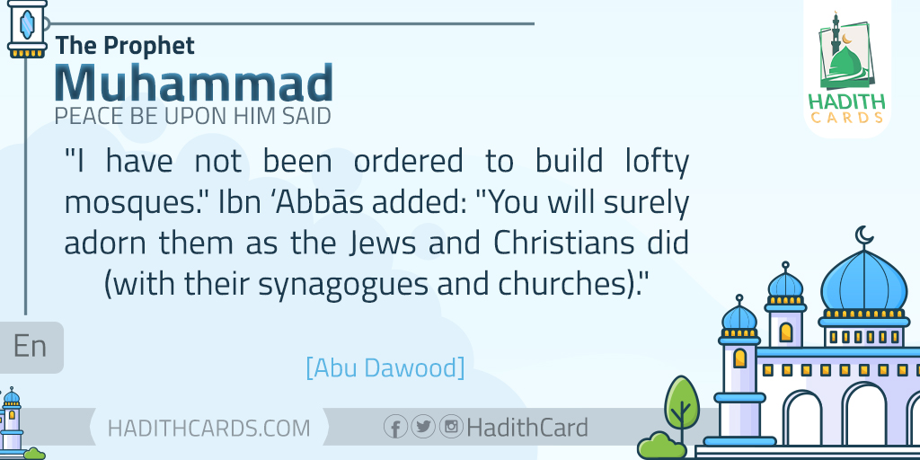 I have not been ordered to build lofty mosques." Ibn ‘Abbās added: "You will surely adorn them as the Jews and Christians did (with their synagogues and churches). [Abu Dawood]