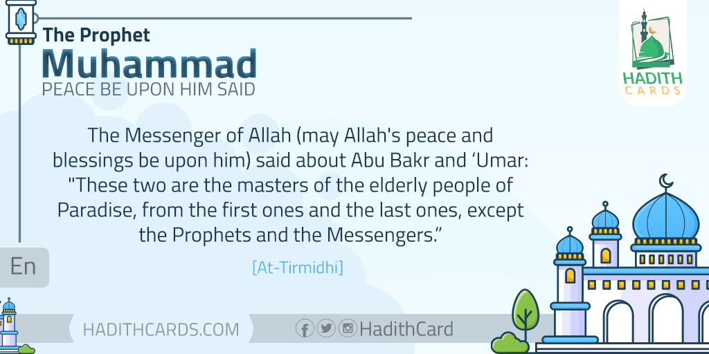 The Messenger of Allah (may Allah's peace and blessings be upon him) said about Abu Bakr and ‘Umar: These two are the masters of the elderly people of Paradise, from the first ones and the last ones, except the Prophets and the Messengers. [At-Tirmidhi]