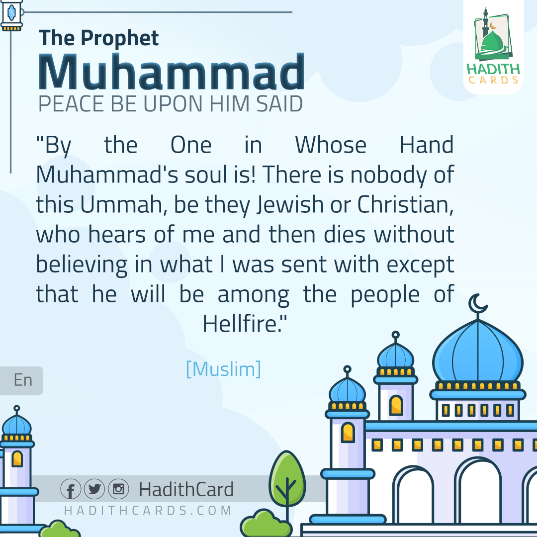 By the One in Whose Hand Muhammad's soul is! There is nobody of this Ummah, be they Jewish or Christian, who hears of me and then dies without believing in what I was sent with except that he will be among the people of Hellfire. [Muslim]