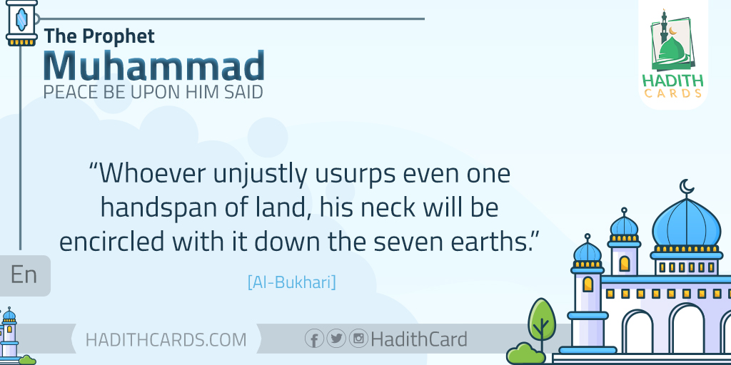 Whoever unjustly usurps even one handspan of land, his neck will be encircled with it down the seven earths. [Al-Bukhari]