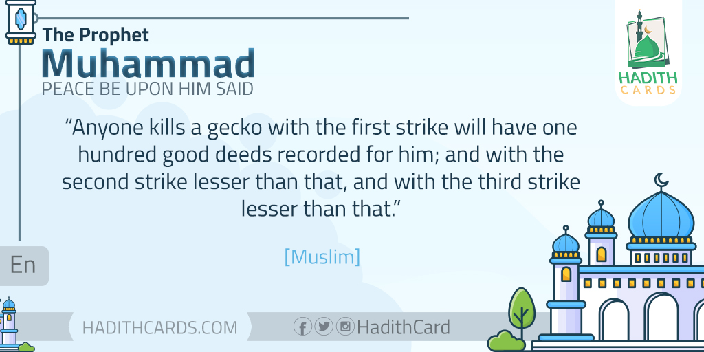 Anyone kills a gecko with the first strike will have one hundred good deeds recorded for him; and with the second strike lesser than that, and with the third strike lesser than that. [Muslim]