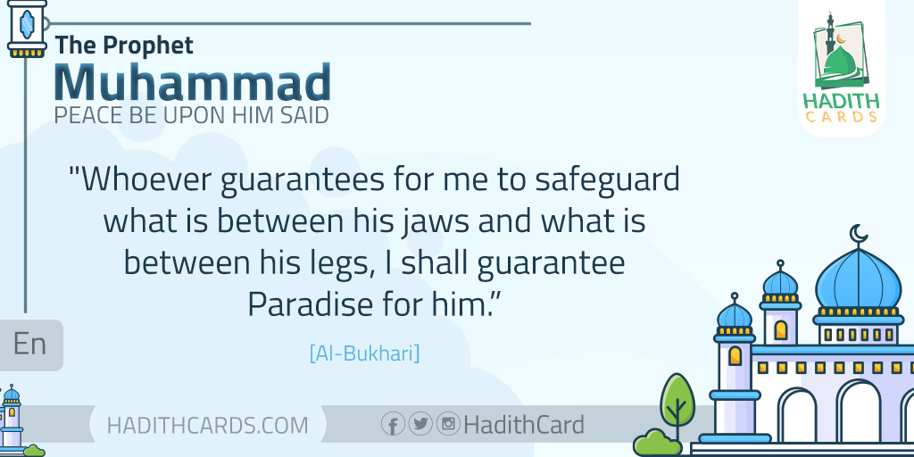 Whoever guarantees for me to safeguard what is between his jaws and what is between his legs, I shall guarantee Paradise for him. [Al-Bukhari]