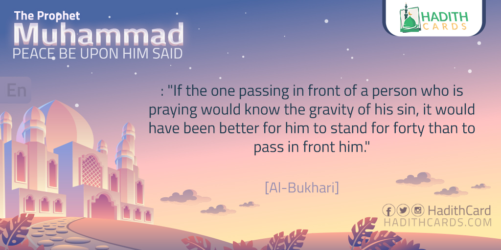 Abu Juhaym ibn al-Hārith ibn As-Simmah al-Ansāri (may Allah be pleased with him) reported directly from the Messenger of Allah (may Allah's peace and blessings be upon him) that he said: "If the one passing in front of a person who is praying would know the gravity of his sin, it would have been better for him to stand for forty than to pass in front him." Abu An-Nadr said: "I am not sure if he said forty days, months, or years.