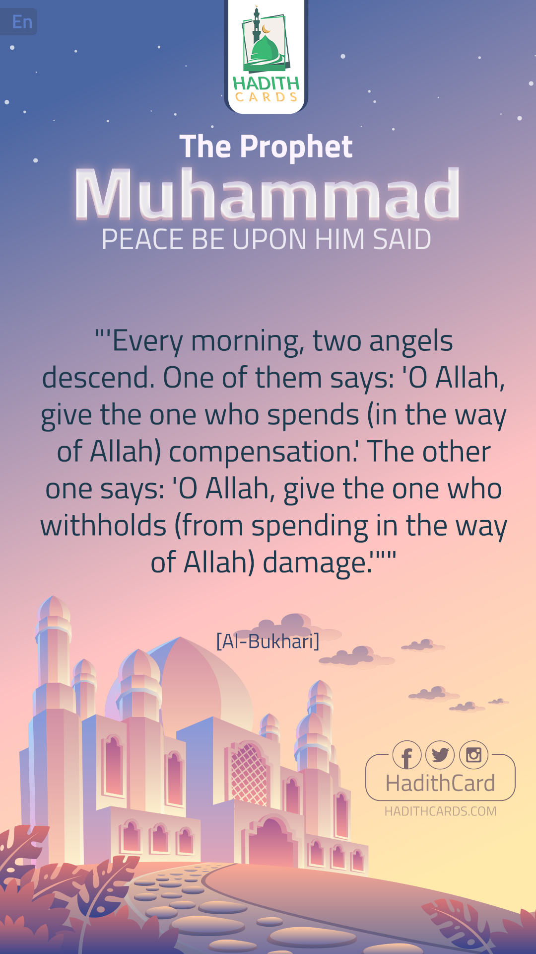 Every morning, two angels descend. One of them says: 'O Allah, give the one who spends (in the way of Allah) compensation.' The other one says: 'O Allah, give the one who withholds (from spending in the way of Allah) damage.