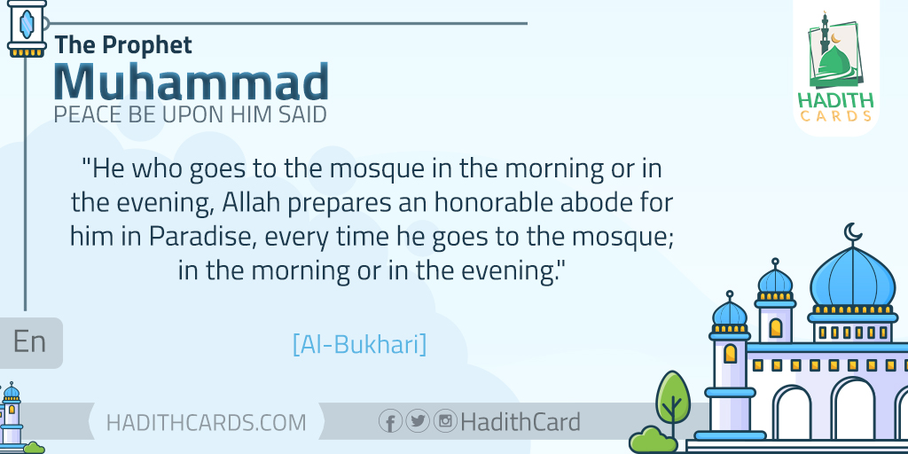 He who goes to the mosque in the morning or in the evening, Allah prepares an honorable abode for him in Paradise, every time he goes to the mosque; in the morning or in the evening.