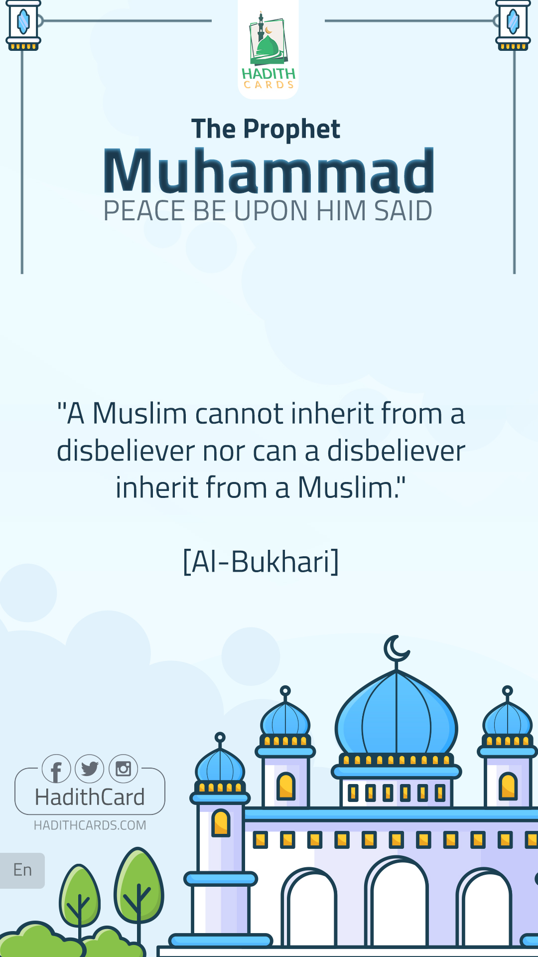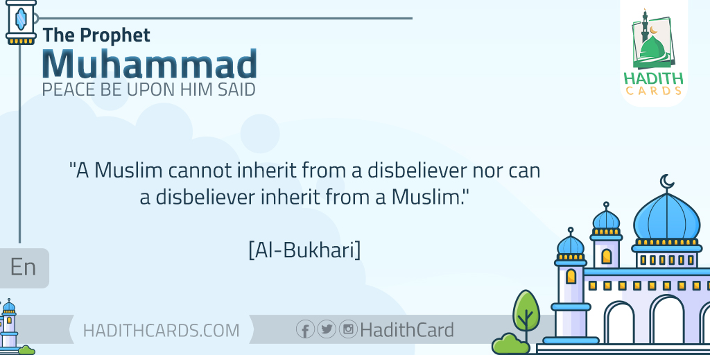 A Muslim cannot inherit from a disbeliever nor can a disbeliever inherit from a Muslim [Al-Bukhari]