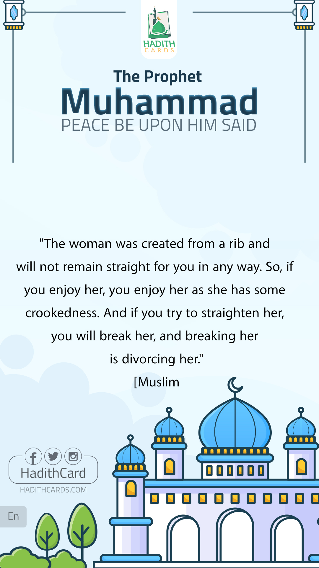 The woman was created from a rib and will not remain straight for you in any way. So, if you enjoy her, you enjoy her as she has some crookedness. And if you try to straighten her, you will break her, and breaking her is divorcing her. [Muslim