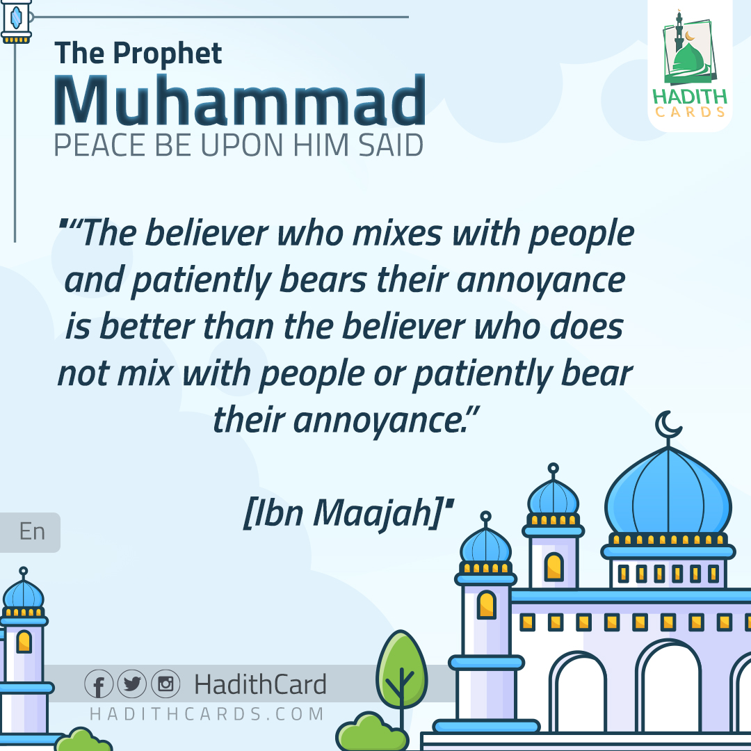 The believer who mixes with people and patiently bears their annoyance is better than the believer who does not mix with people or patiently bear their annoyance. [Ibn Maajah]