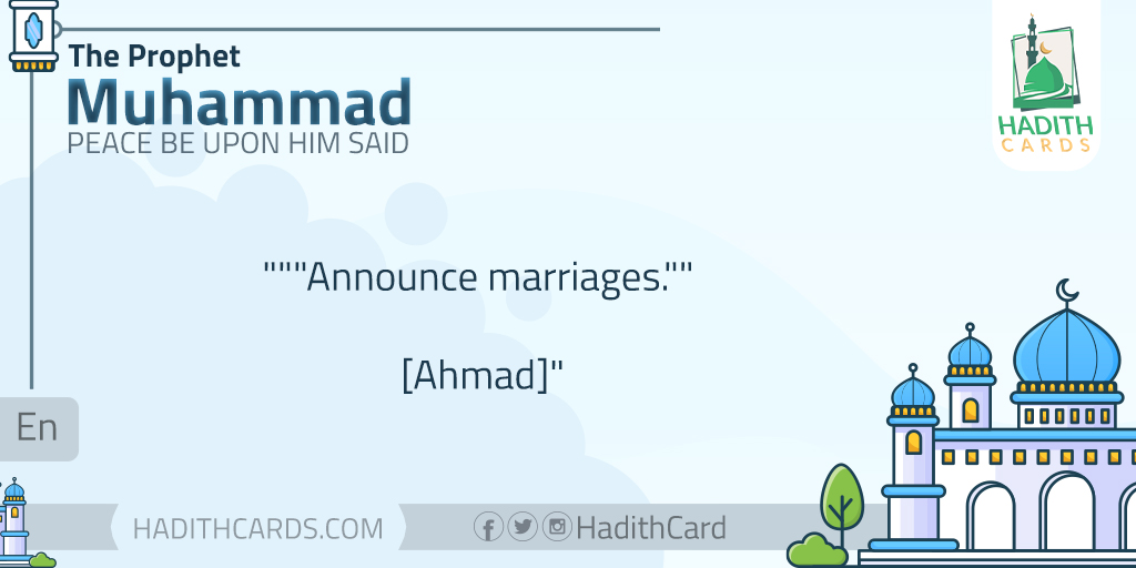 """أعْلِنُوا النِّكاح"". [حسن.] - [رواه أحمد.]"