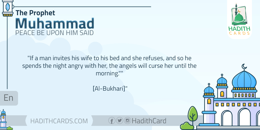 "«إذا دعا الرجل امرأته إلى فراشه فَأَبَتْ فَبَاتَ غَضْبَانَ عليها لَعَنَتْهَا الملائكة حتى تصبح».