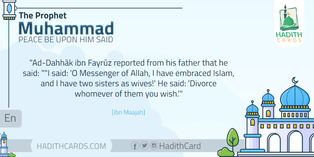 Ad-Dahhāk ibn Fayrūz reported from his father that he said: "I said: 'O Messenger of Allah, I have embraced Islam, and I have two sisters as wives!' He said: 'Divorce whomever of them you wish.