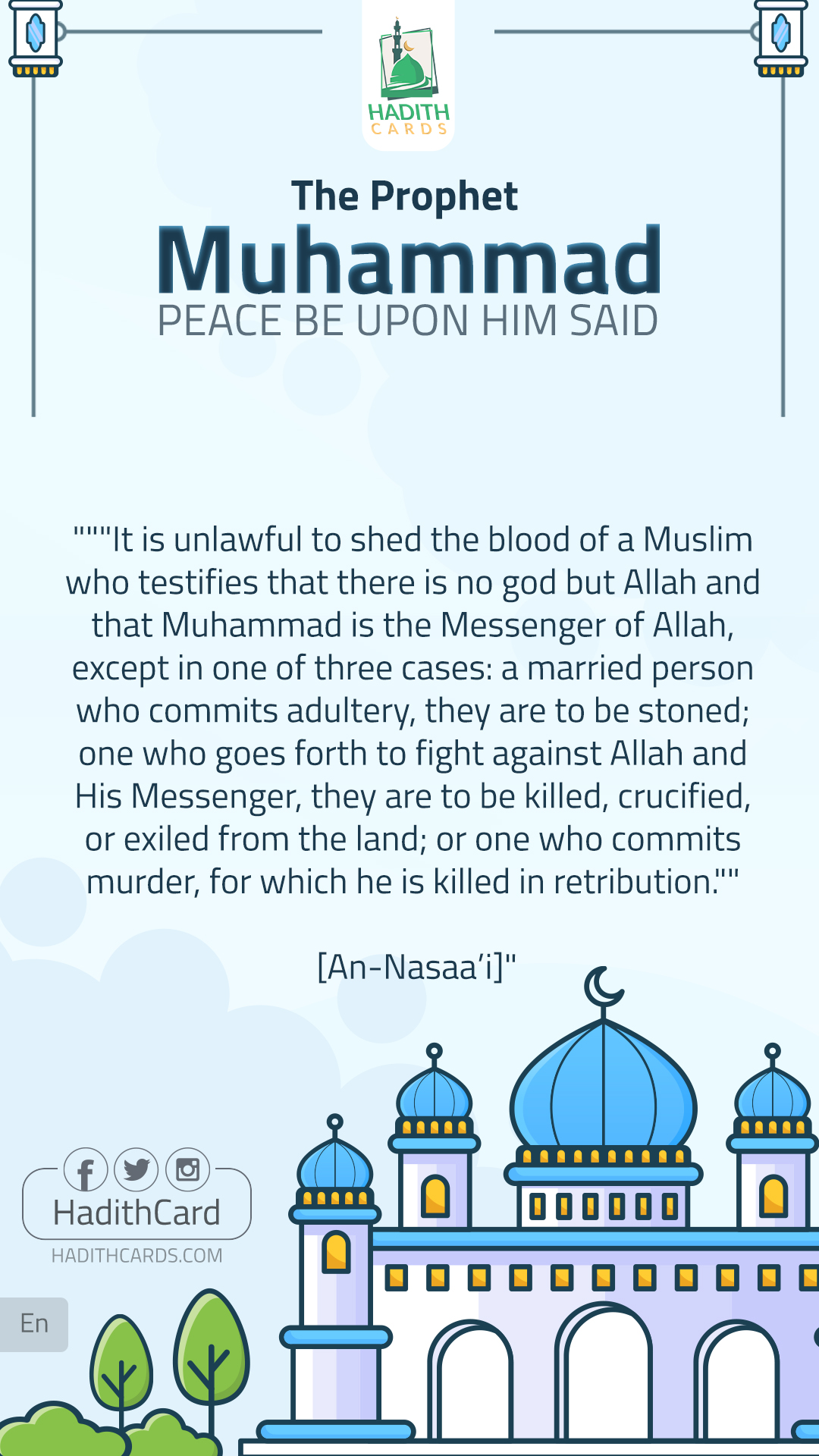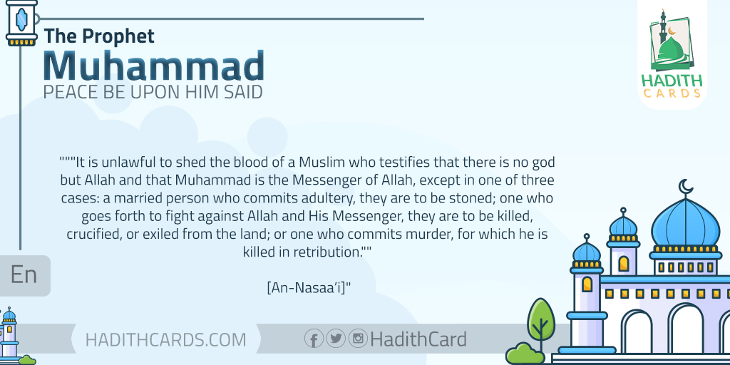 """لا يَحِلّ دمُ امرئ مسلم، يشهد أن لا إله إلا الله، وأن محمدًا رسول الله، إلا بإحدى ثلاث: رجل زَنَى بَعْدَ إِحْصَان، فإنه يُرْجَم، ورجل خرج مُحاربًا لله ورسوله، فإنه يُقَتُل، أو يُصلَّبُ، أو يُنفى من الأرض، أو يَقتلَ نفسًا، فيُقتلُ بها"".