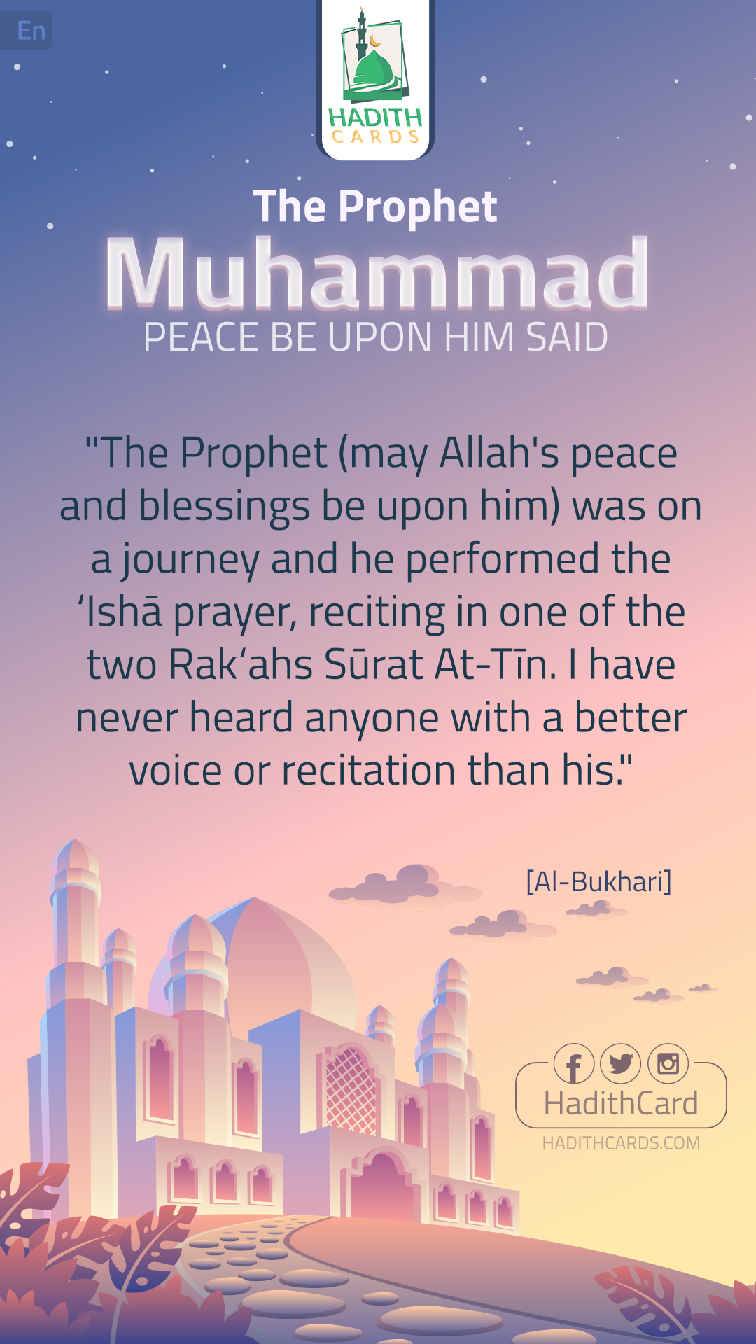 The Prophet (may Allah's peace and blessings be upon him) was on a journey and he performed the ‘Ishā prayer, reciting in one of the two Rak‘ahs Sūrat At-Tīn. I have never heard anyone with a better voice or recitation than his.