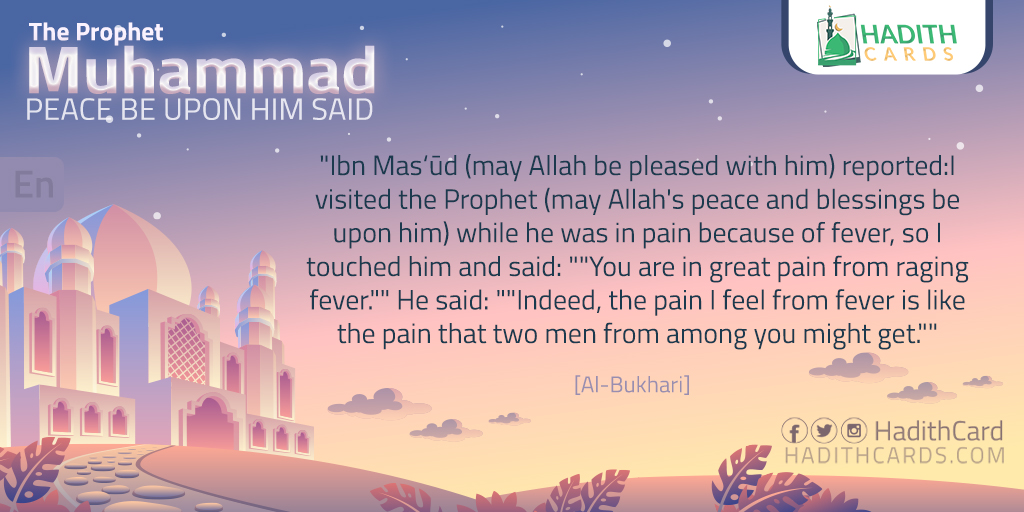 Ibn Mas‘ūd (may Allah be pleased with him) reported: I visited the Prophet (may Allah's peace and blessings be upon him) while he was in pain because of fever, so I touched him and said: "You are in great pain from raging fever." He said: "Indeed, the pain I feel from fever is like the pain that two men from among you might get."
