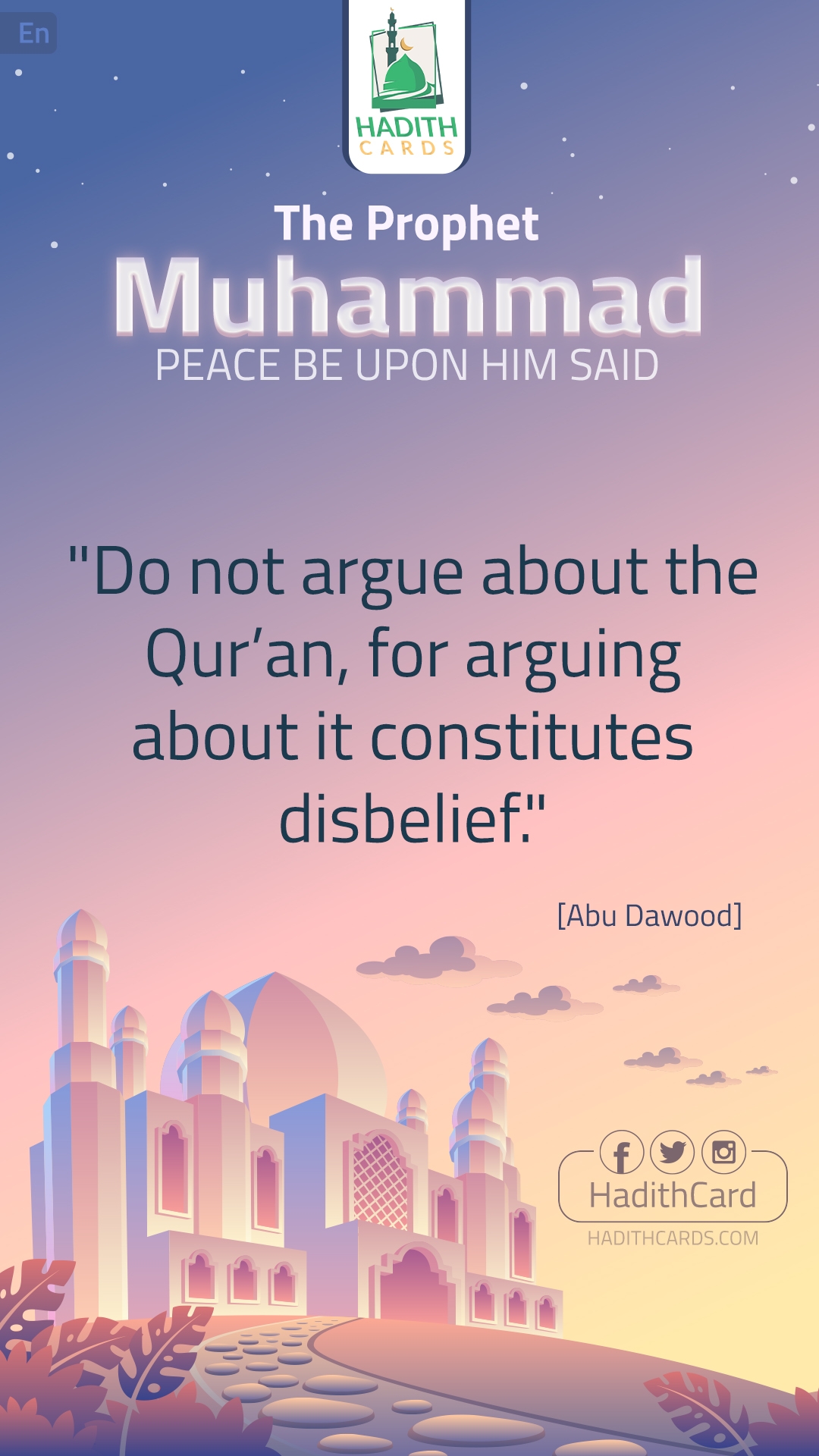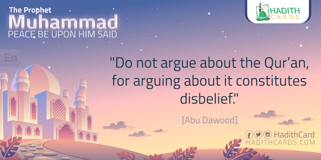 «لا تُجادِلوا في القرآن؛ فإنَّ جِدالًا فيه كُفرٌ». (أبو داود)