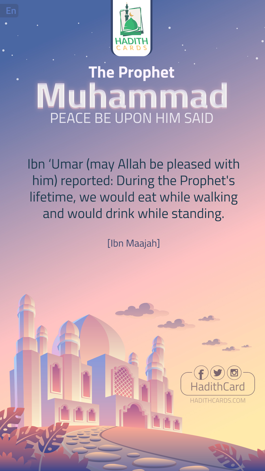 عن ابنِ عُمَرَ -ما-، قال: كُنَّا على عَهْدِ رسولِ اللهِ -صلى الله عليه وسلم- نَأْكُلُ ونحنُ نَمْشِي، ونَشْرَبُ ونحنُ قِيَامٌ. (ابن ماجه)