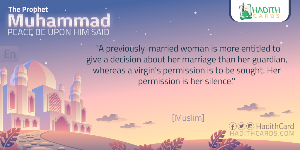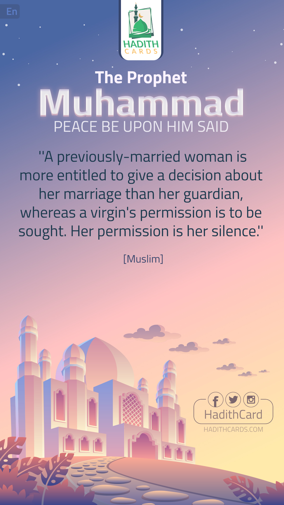 A previously-married woman is more entitled to give a decision about her marriage than her guardian, whereas a virgin's permission is to be sought. Her permission is her silence.' [Muslim]