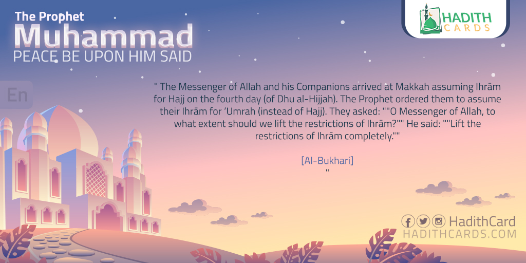 " The Messenger of Allah and his Companions arrived at Makkah assuming Ihrām for Hajj on the fourth day (of Dhu al-Hijjah). The Prophet ordered them to assume their Ihrām for ‘Umrah (instead of Hajj). They asked: ""O Messenger of Allah, to what extent should we lift the restrictions of Ihrām?" He said: ""Lift the restrictions of Ihrām completely."