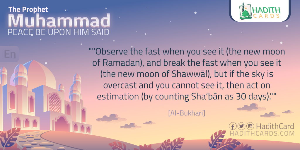 "عن عبد الله بن عمر -رضي الله عنهما- قال: سمعت رسول الله -صلى الله عليه وسلم- يقول: «إذا رَأَيْتمُوه فَصُومُوا، وإذا رَأَيْتُمُوه فَأفْطِروُا، فإن غُمَّ عليكم فَاقْدُرُوا له».