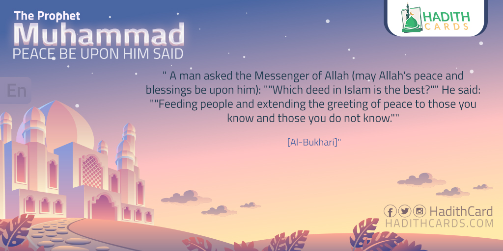 " A man asked the Messenger of Allah (may Allah's peace and blessings be upon him): ""Which deed in Islam is the best?"" He said: ""Feeding people and extending the greeting of peace to those you know and those you do not know.""