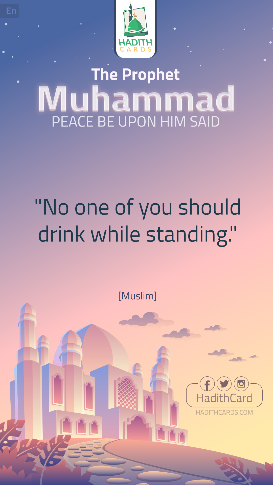 عن أبي هريرة -- قال: قال رسول الله -صلى الله عليه وسلم-: «لا يشربَنَّ أحدٌ منكم قائما». (مسلم)