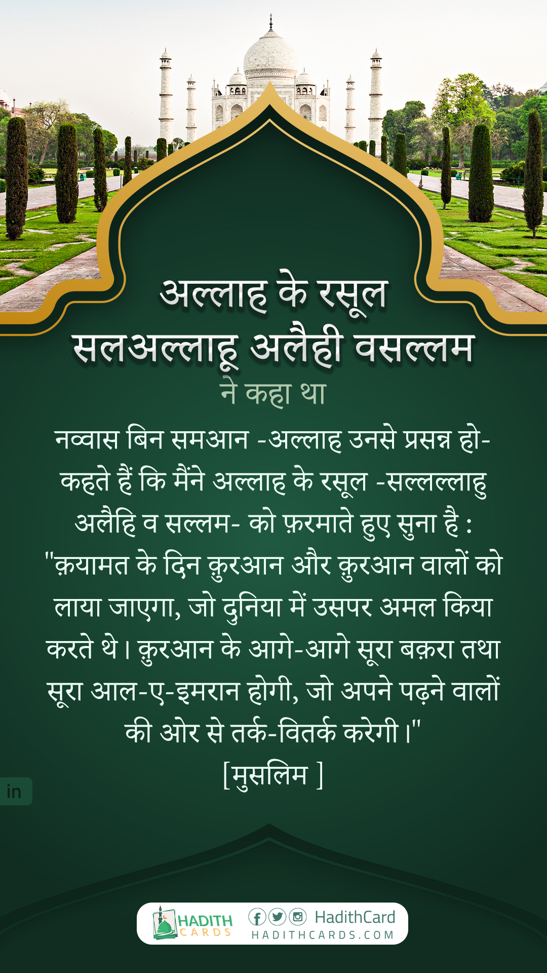 नव्वास बिन समआन -अल्लाह उनसे प्रसन्न हो- कहते हैं कि मैंने अल्लाह के रसूल -सल्लल्लाहु अलैहि व सल्लम- को फ़रमाते हुए सुना है : "क़यामत के दिन क़ुरआन और क़ुरआन वालों को लाया जाएगा, जो दुनिया में उसपर अमल किया करते थे। क़ुरआन के आगे-आगे सूरा बक़रा तथा सूरा आल-ए-इमरान होगी, जो अपने पढ़ने वालों की ओर से तर्क-वितर्क करेगी।