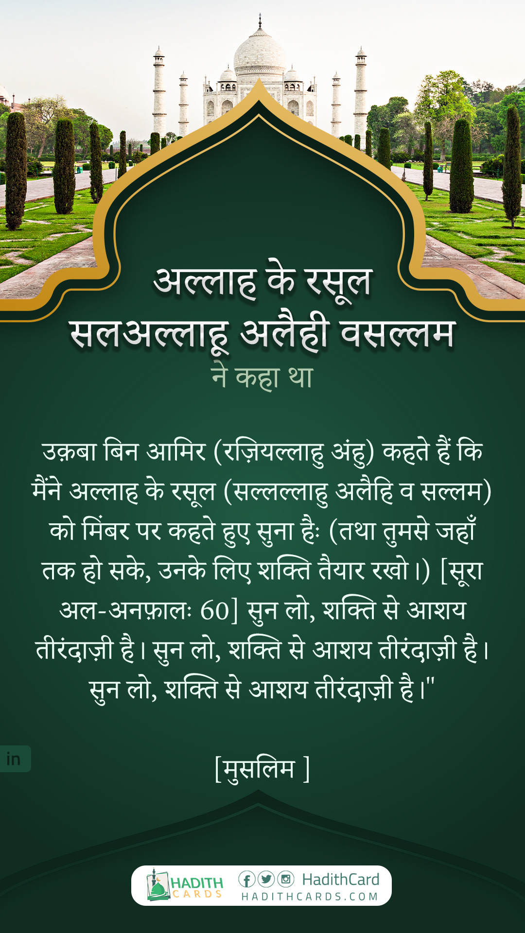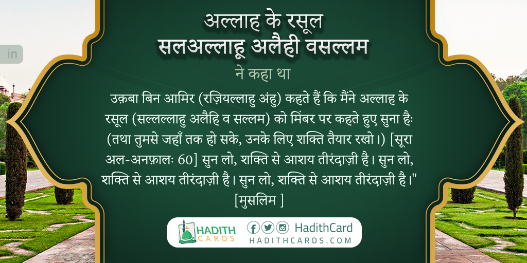 उक़बा बिन आमिर (रज़ियल्लाहु अंहु) कहते हैं कि मैंने अल्लाह के रसूल (सल्लल्लाहु अलैहि व सल्लम) को मिंबर पर कहते हुए सुना हैः (तथा तुमसे जहाँ तक हो सके, उनके लिए शक्ति तैयार रखो।) [सूरा अल-अनफ़ालः 60] सुन लो, शक्ति से आशय तीरंदाज़ी है। सुन लो, शक्ति से आशय तीरंदाज़ी है। सुन लो, शक्ति से आशय तीरंदाज़ी है।"