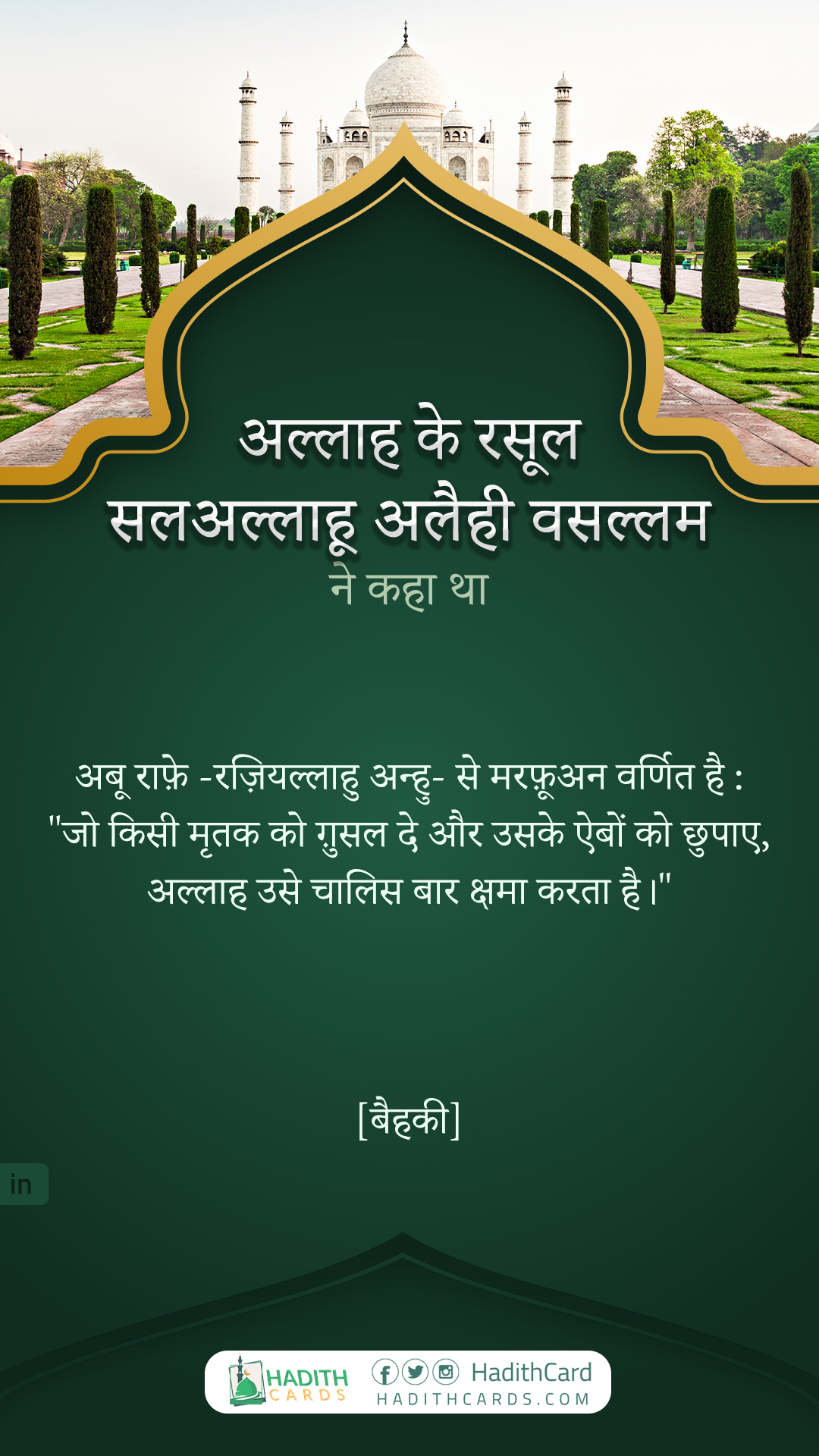 "عن أبي رافع -رضي الله عنه- مرفوعاً: «من غسَّل ميتاً فكتم عليه، غفر الله له أربعين مرة».