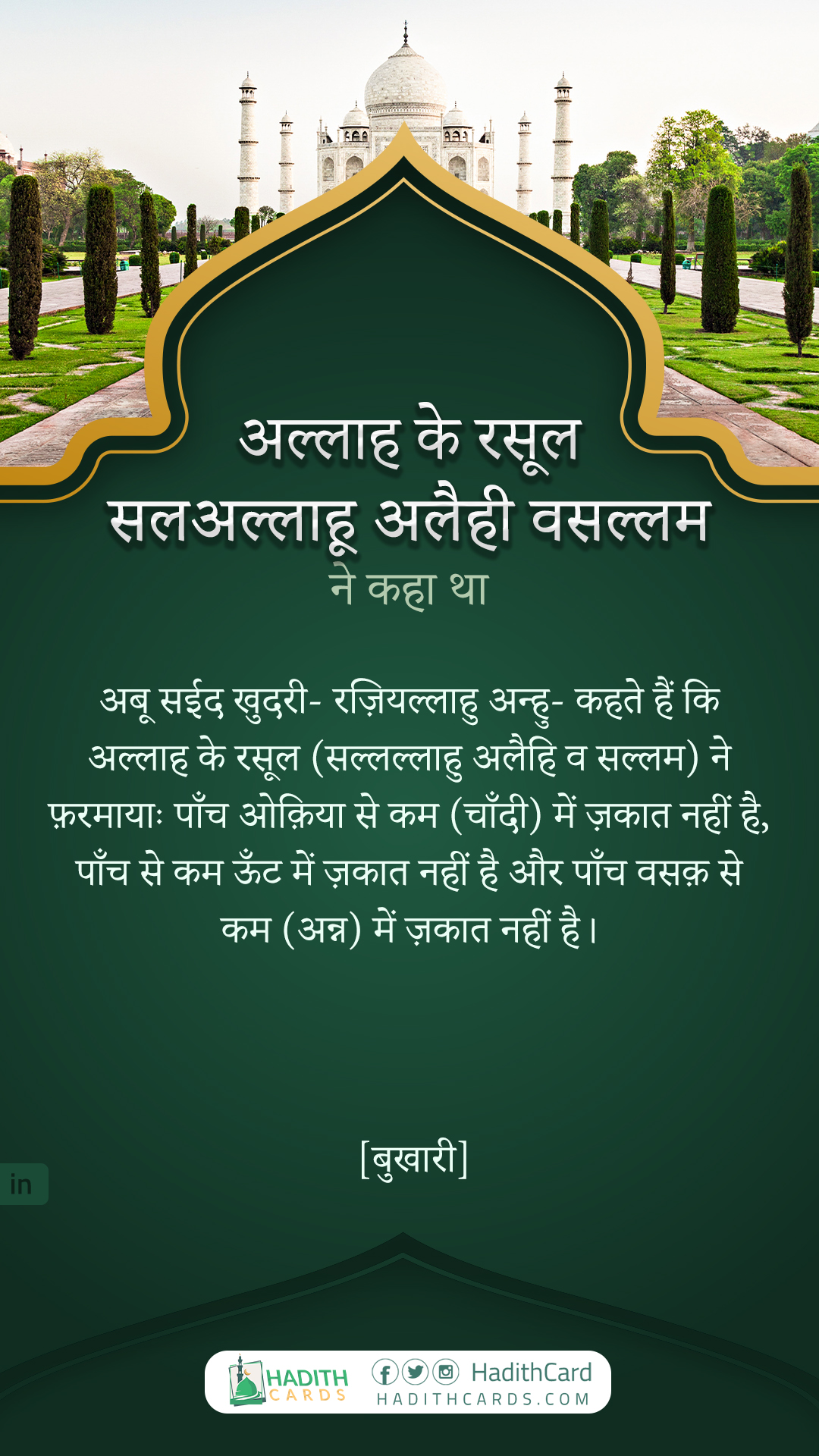 अबू सईद खुदरी- रज़ियल्लाहु अन्हु- कहते हैं कि अल्लाह के रसूल (सल्लल्लाहु अलैहि व सल्लम) ने फ़रमायाः पाँच ओक़िया से कम (चाँदी) में ज़कात नहीं है, पाँच से कम ऊँट में ज़कात नहीं है और पाँच वसक़ से कम (अन्न) में ज़कात नहीं है।