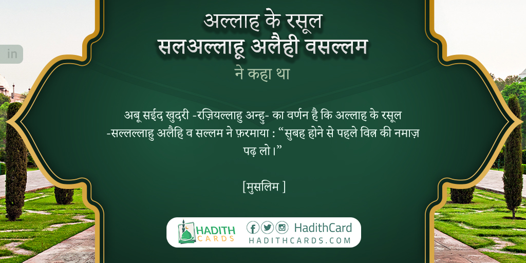 अबू सईद खुदरी -रज़ियल्लाहु अन्हु- का वर्णन है कि अल्लाह के रसूल -सल्लल्लाहु अलैहि व सल्लम ने फ़रमाया : “सुबह होने से पहले वित्र की नमाज़ पढ़ लो।