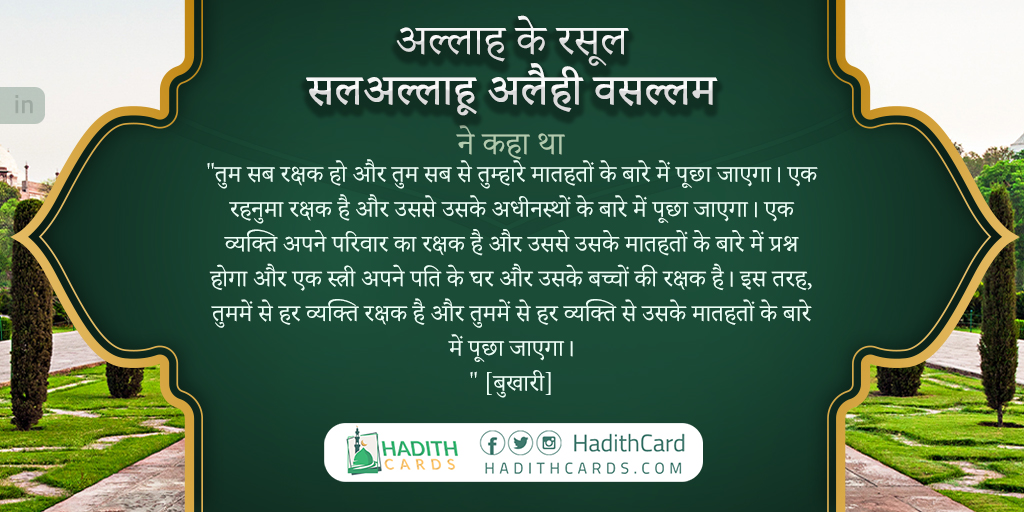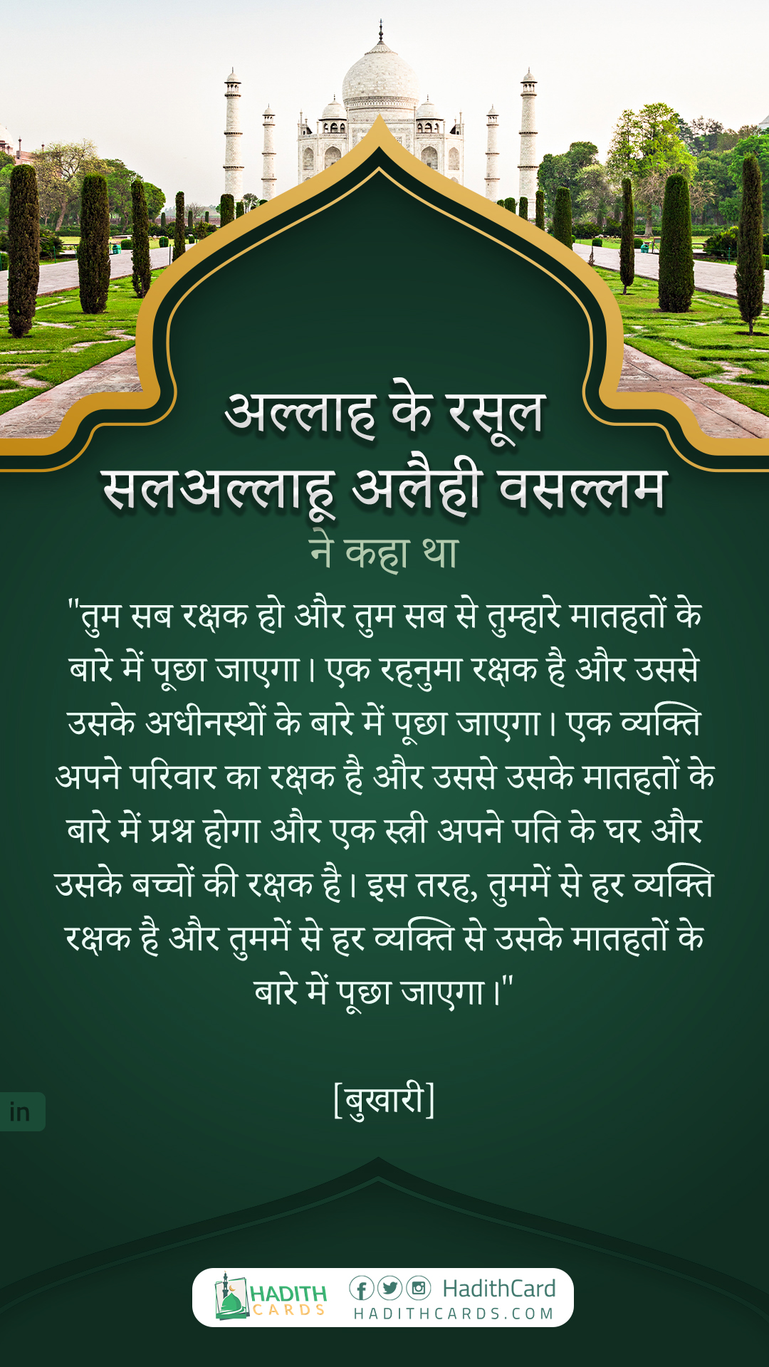 तुम सब रक्षक हो और तुम सब से तुम्हारे मातहतों के बारे में पूछा जाएगा। एक रहनुमा रक्षक है और उससे उसके अधीनस्थों के बारे में पूछा जाएगा। एक व्यक्ति अपने परिवार का रक्षक है और उससे उसके मातहतों के बारे में प्रश्न होगा और एक स्त्री अपने पति के घर और उसके बच्चों की रक्षक है। इस तरह, तुममें से हर व्यक्ति रक्षक है और तुममें से हर व्यक्ति से उसके मातहतों के बारे में पूछा जाएगा।