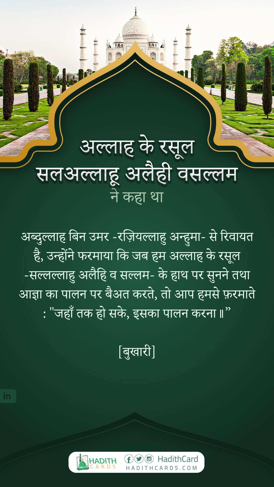 अब्दुल्लाह बिन उमर -रज़ियल्लाहु अन्हुमा- से रिवायत है, उन्होंने फरमाया कि जब हम अल्लाह के रसूल -सल्लल्लाहु अलैहि व सल्लम- के हाथ पर सुनने तथा आज्ञा का पालन पर बैअत करते, तो आप हमसे फ़रमाते : "जहाँ तक हो सके, इसका पालन करना।।