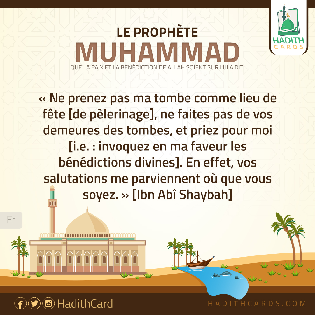 Ne prenez pas ma tombe comme lieu de fête [de pèlerinage], ne faites pas de vos demeures des tombes, et priez pour moi [i.e. : invoquez en ma faveur les bénédictions divines]. En effet, vos salutations me parviennent où que vous soyez
