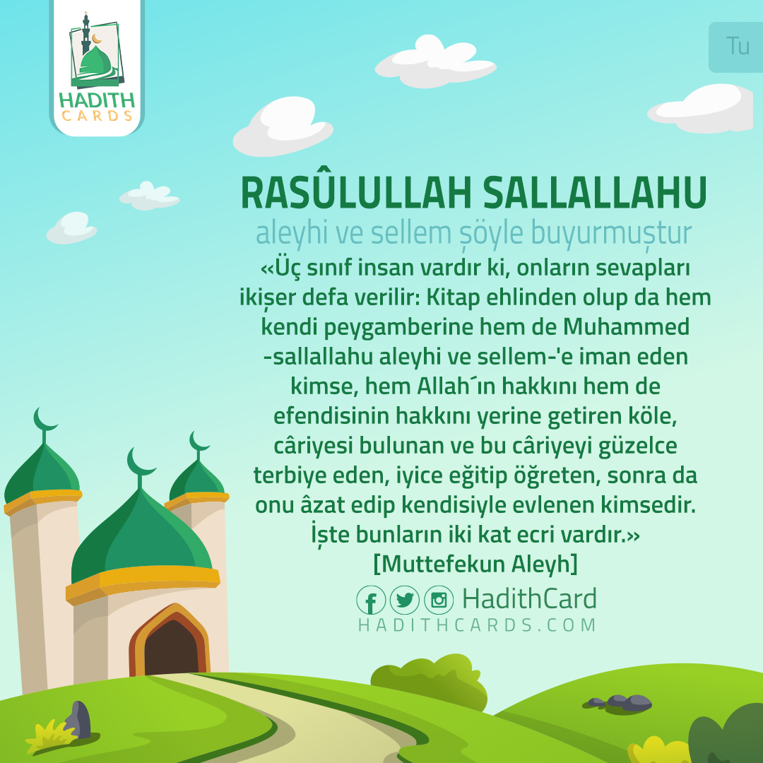 Üç sınıf insan vardır ki, onların sevapları ikişer defa verilir: Kitap ehlinden olup da hem kendi peygamberine hem de Muhammed -sallallahu aleyhi ve sellem-'e iman eden kimse, hem Allah´ın hakkını hem de efendisinin hakkını yerine getiren köle, câriyesi bulunan ve bu câriyeyi güzelce terbiye eden, iyice eğitip öğreten, sonra da onu âzat edip kendisiyle evlenen kimsedir. İşte bunların iki kat ecri vardır