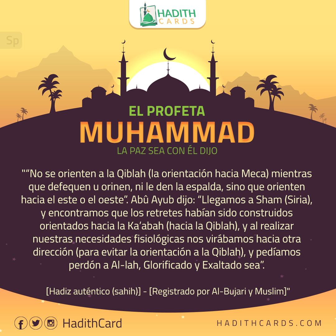 No se orienten a la Qiblah (la orientación hacia Meca) mientras que defequen u orinen, ni le den la espalda, sino que orienten hacia el este o el oeste”. Abû Ayub dijo: “Llegamos a Sham (Siria), y encontramos que los retretes habían sido construidos orientados hacia la Ka’abah (hacia la Qiblah), y al realizar nuestras necesidades fisiológicas nos virábamos hacia otra dirección (para evitar la orientación a la Qiblah), y pedíamos perdón a Al-lah, Glorificado y Exaltado sea