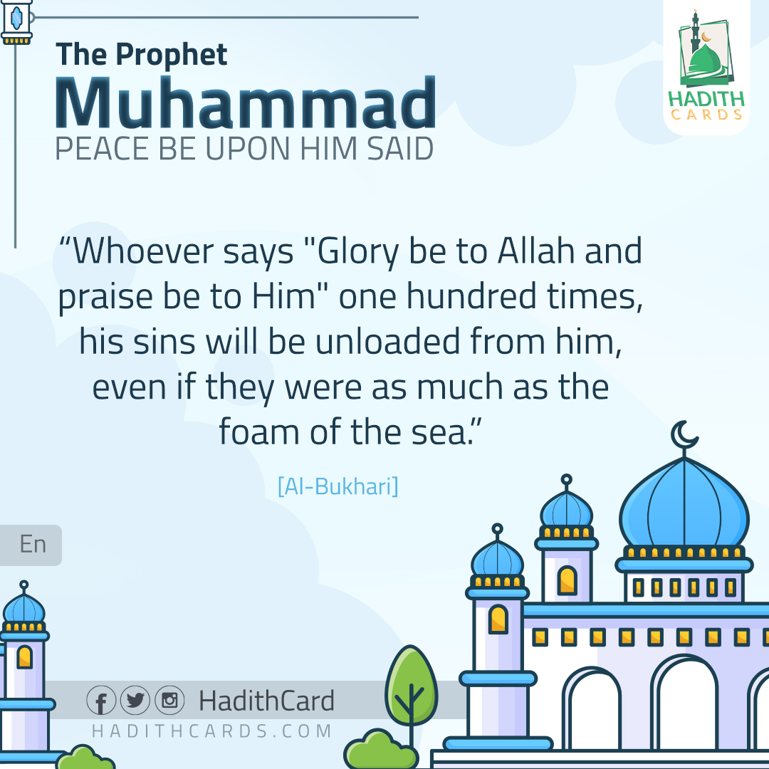 Whoever says "Glory be to Allah and praise be to Him" one hundred times, his sins will be unloaded from him, even if they were as much as the foam of the sea. [Al-Bukhari]
