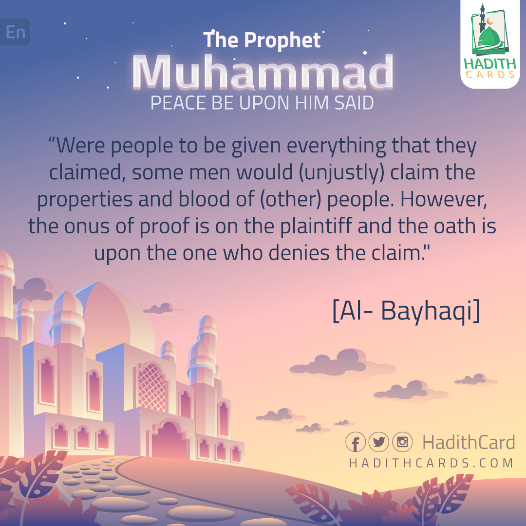 Were people to be given everything that they claimed, some men would (unjustly) claim the properties and blood of (other) people. However, the onus of proof is on the plaintiff and the oath is upon the one who denies the claim. [Al- Bayhaqi]